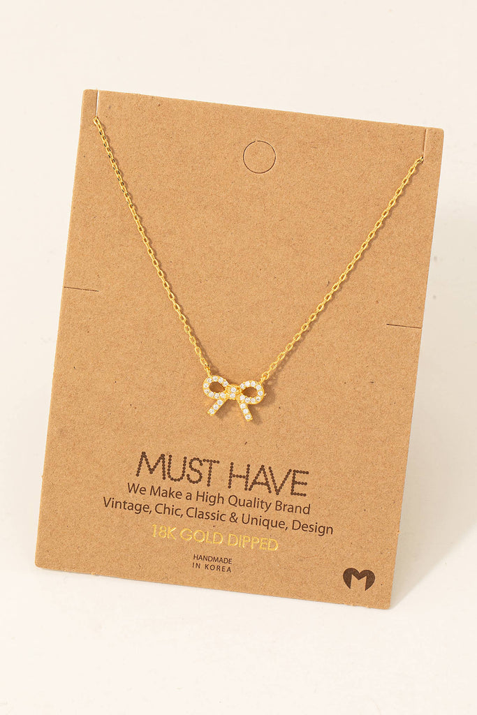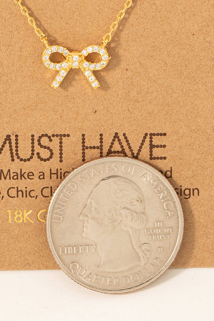 This necklace introduces a stunning gold dipped cz stud ribbon bow pendant style. Elevate your ensemble with this chic, timeless accessory.