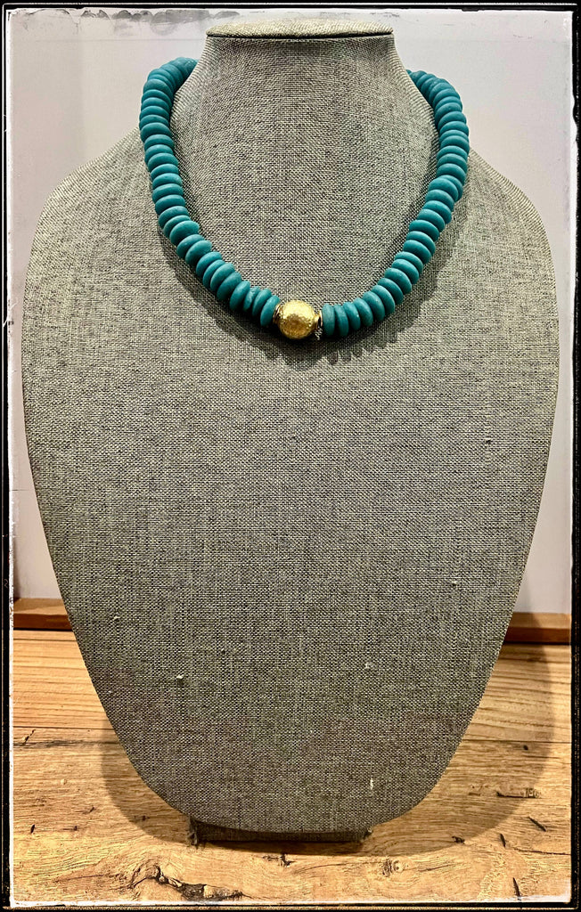 Green Teal Recycled Glass Short Necklace Brass Ball Pendant