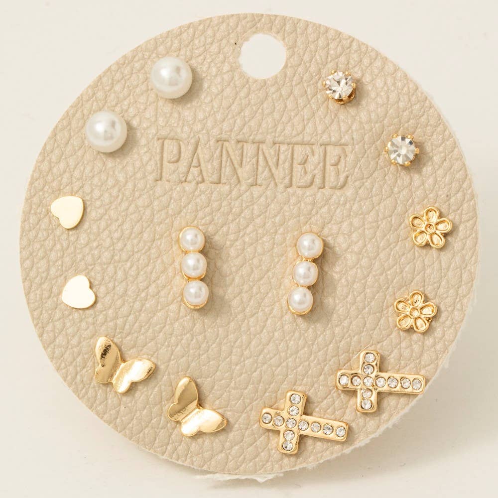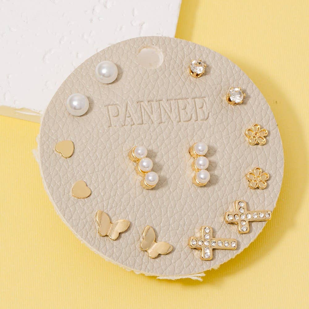 Heart Pearls Flower And Cross Stud Earrings Set