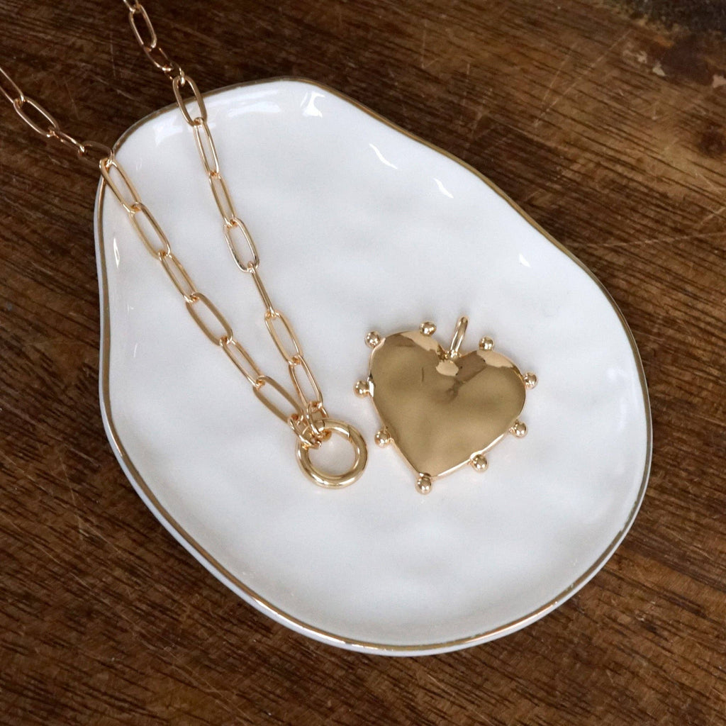 Modern Spiky Heart Paperclip Necklace - Gold Tone A bold and modern statement piece, this necklace features a spiky heart-shaped pendant that effortlessly blends edgy design with elegance. The openable pendant jump ring allows for versatile styling, making it a unique addition to your jewelry collection. Details: * 15" paperclip chain + extender * 1.25" interchangeable hammered spiky heart pendant * Openable pendant jump ring for versatile styling