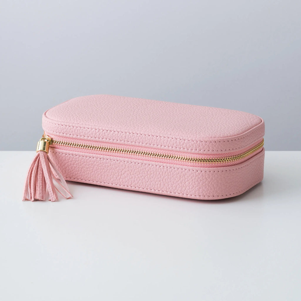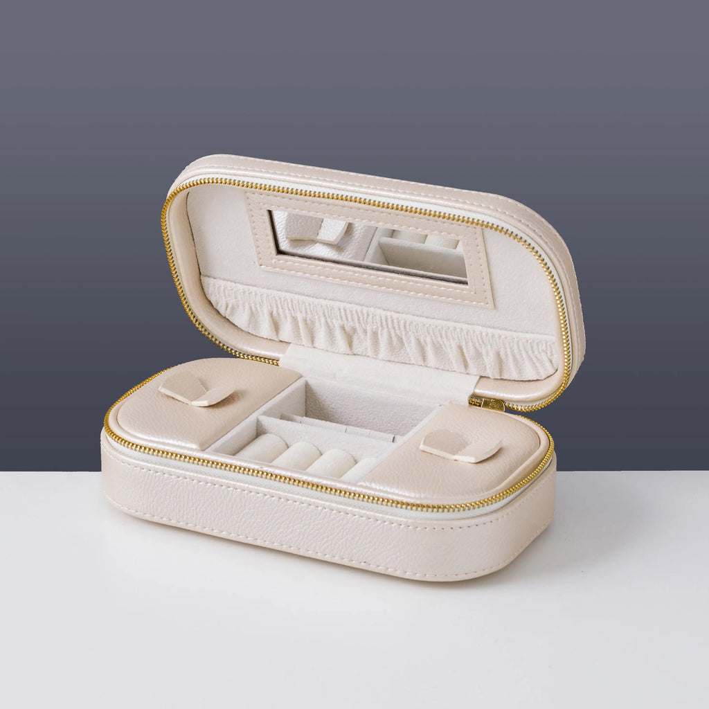 Organize and protect your jewelry on-the-go with this modern, stylish, zip-around case. The perfect travel companion for your favorite accessories, includes a mirror for those get-ready moments wherever you are. Elegant textured PU leather exterior. Colors Available: Champagne, Pink Material: PU Leather Interior: Velvet Features: Mirror inside Weight: 0.64 lb Dimensions: 7''L x 4''W x 2 ''H