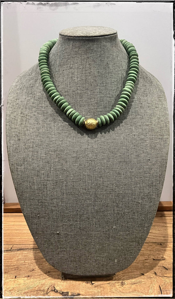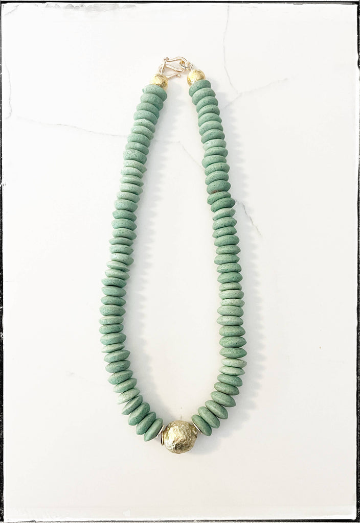 Pistachio Green Recycled Glass Short Necklace Brass Ball Pendant • Handmade item in a clean, safe environment • Bead material- Glass & Brass beads • Gold brass textured spacer Beads • Recycled Glass Beads- light pistachio green • Large textured brass ball • Length- 10” top to Bottom • Necklace is strung with antiqued brass gold toggle closure