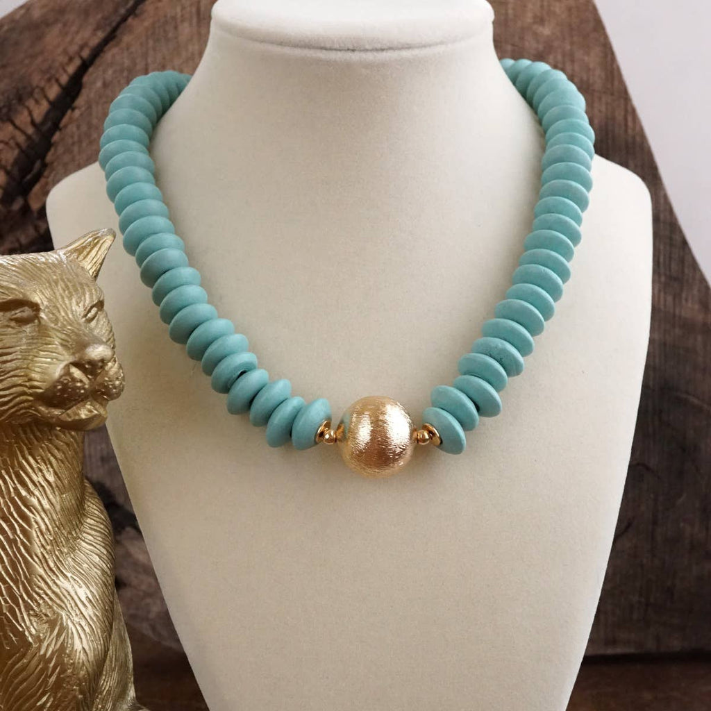 Wood Saucer Beads Short Statement Necklace Gold center Turquoise