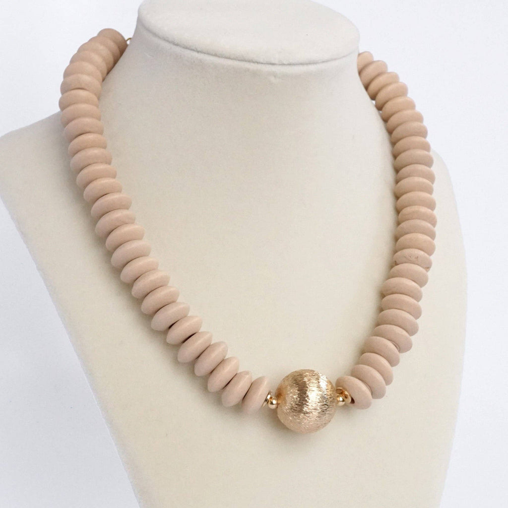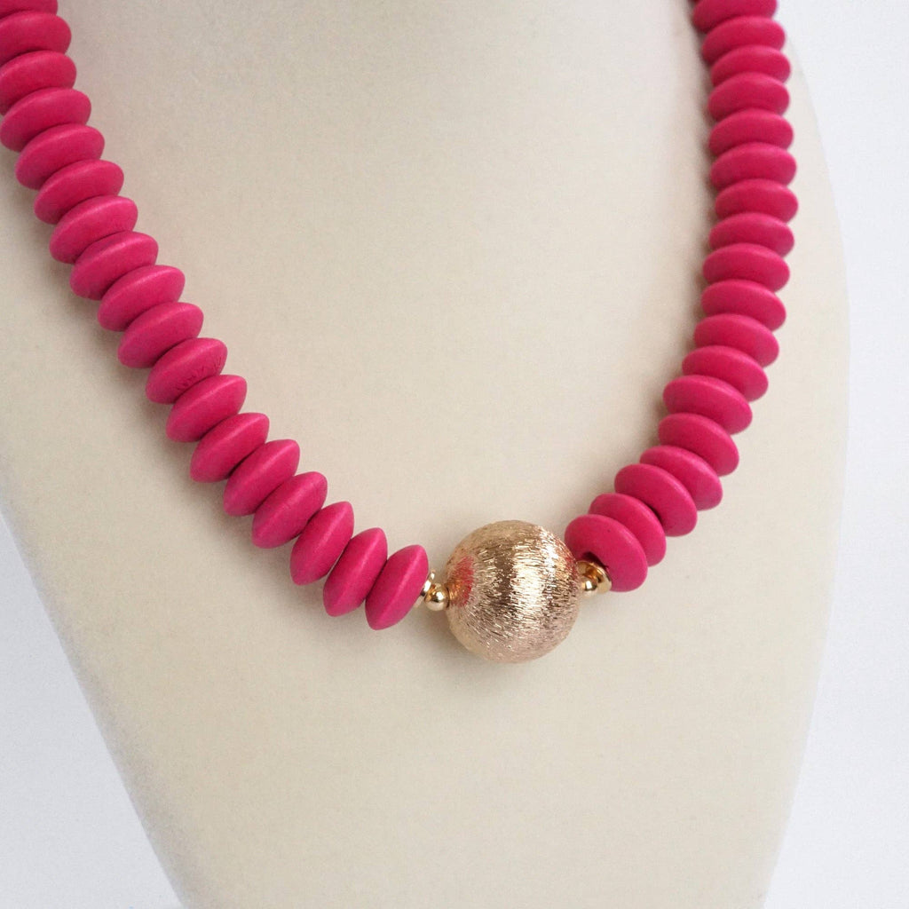 Wood Beads Short Statement Necklace Gold center Hot Pink Beige Chunky saucer wooden beads Big chunky textured golden ball center bead Gold tone spacer beads Large lobster claw closure 16" + extender