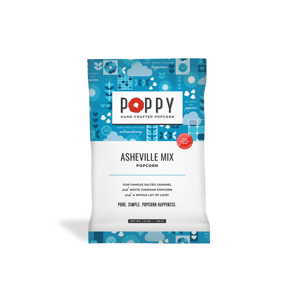 A perfect mix of Salted Caramel and White Cheddar popcorn in a portable 2.6 oz snack bag. The taste of Asheville, ready for your customers to enjoy on the go or add to a gift basket.