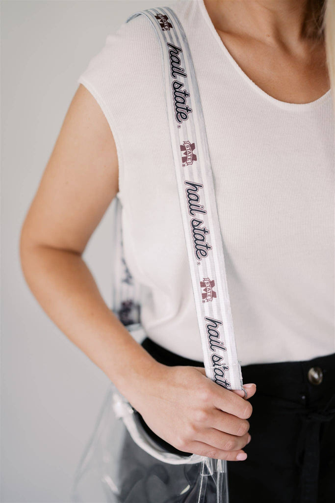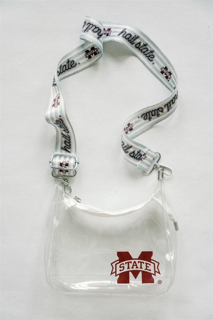 Cheer on the Bulldogs in style with our officially licensed Mississippi State clear stadium bag. Featuring a bold State logo and a thick adjustable strap with “Hail State” lettering, this bag meets stadium regulations while adding a game day-ready touch to your outfit. Lightweight, durable, and easy to wear crossbody or on the shoulder—it's perfect for football season and beyond.tional, and stylish—it’s your new go-to for sporting events, concerts, and campus life.