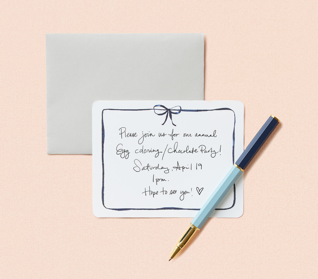 This boxed set of 8 flat notecards features a chic navy bow design, perfect for sending thank-yous, invitations, or any quick notes in style. With their timeless appeal, these flat notes are ideal for anyone who appreciates understated elegance. Printed on heavyweight, natural white paper, each card offers a smooth surface for your handwritten messages. The rounded corners and fun backing design enhance the elegant feel, making these cards as delightful to send as they are to receive. Proudly made in the USA, the Navy Bow Flat Notes come in eco-friendly, plastic-free packaging, reflecting our commitment to sustainability while offering you high-quality stationery. Product Highlights: Boxed set of 8 flat notecards (4.25 x 5.5 inches) Elegant navy bow design, perfect for any occasion Printed on heavyweight, natural white paper Rounded corners and fun backing design Eco-friendly, plastic-free packaging Made in the USA