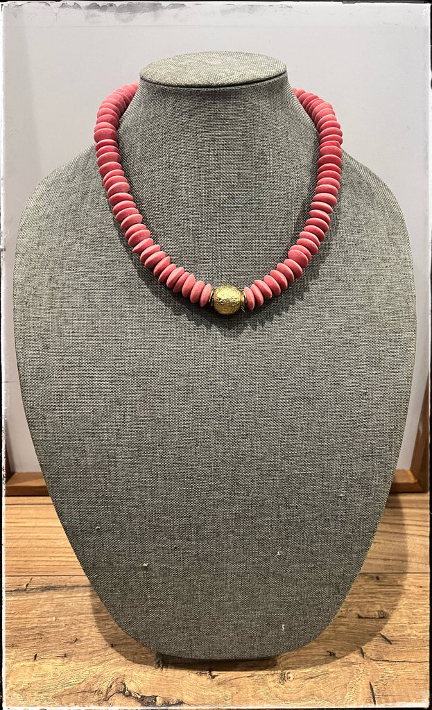 Medium Pink Recycled Glass Short Necklace Brass Ball Pendant • Handmade item in a clean, safe environment • Bead material- Glass & Brass beads • Gold brass textured spacer Beads • Recycled Glass Beads- medium pink print • Large textured brass ball • Length- 10” top to Bottom • Necklace is strung with antiqued brass gold toggle closure
