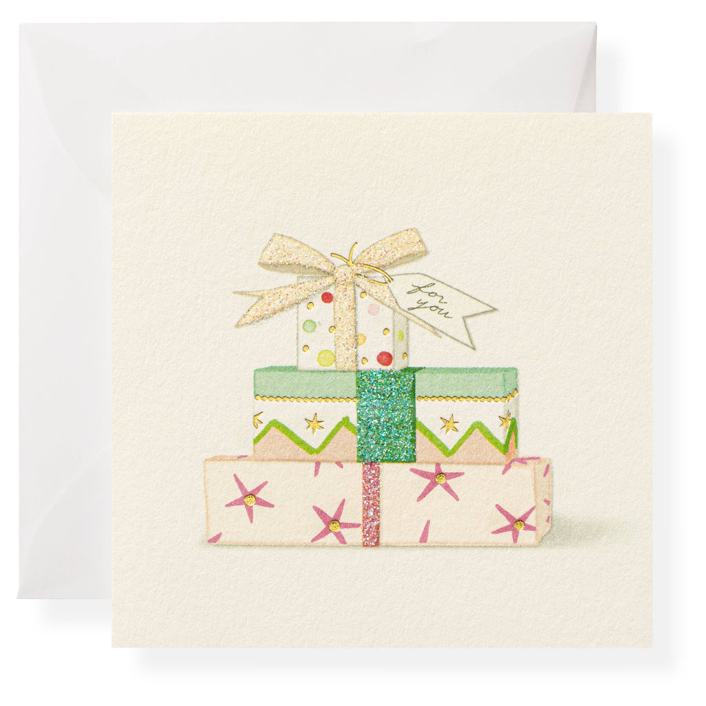 Our Presents Gift Enclosure is printed and hand-glittered in Memphis, TN. Hand crafted artwork, full color ink printed on natural white paper, hand-glittered, and paired with a vellum envelope. Book-folded enclosure card, blank on the inside. Paper color | natural white. Envelope color | vellum. Print process | full color. Embellishment | hand-glittered. Dimensions | 3 x 3 inches.