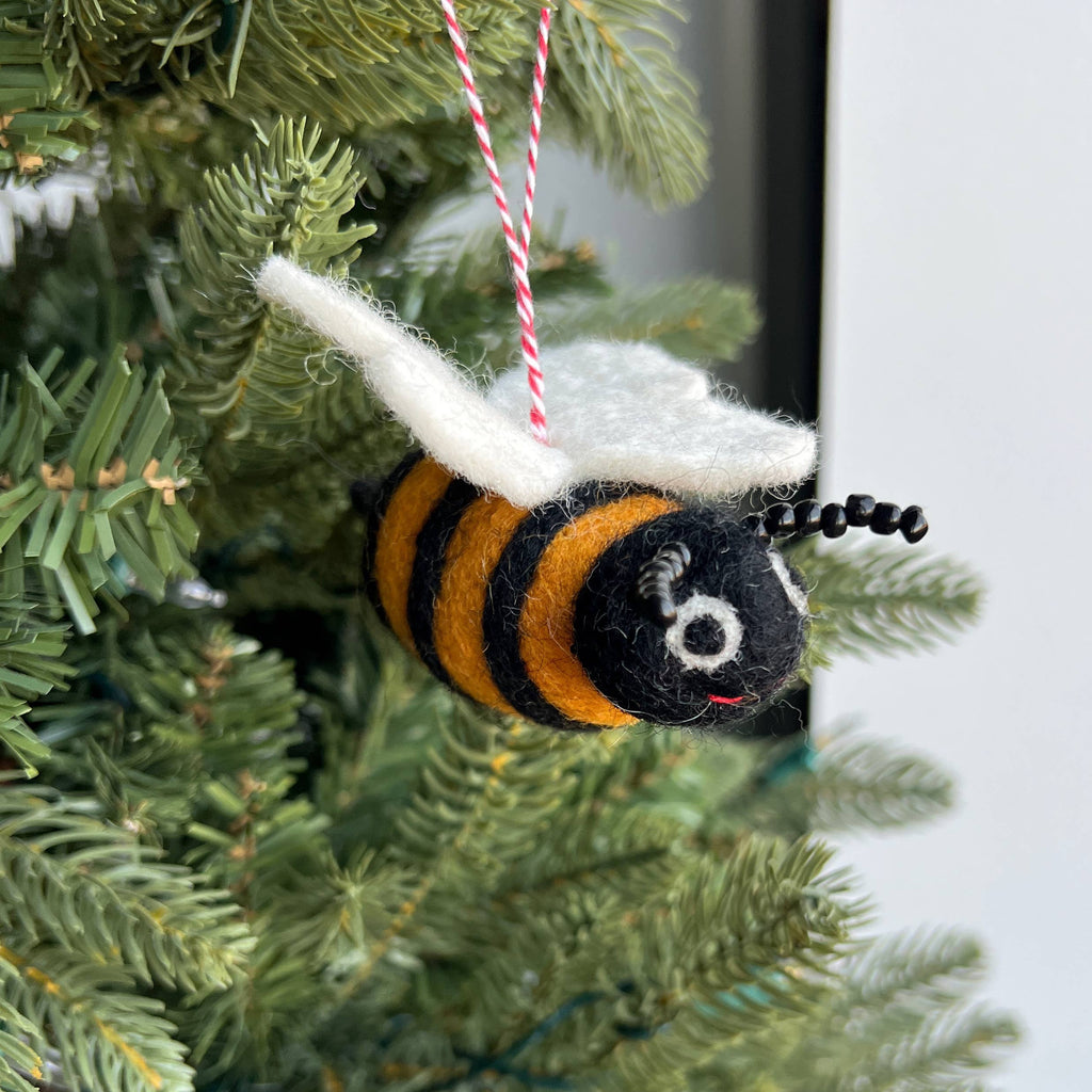 Buzz into the holiday season with our Bee Ornament! This sweet honey bee will add natural charm to your Christmas tree. Our Felt Wool Ornaments are handmade by artisans in Nepal, Asia using colorful sheep wool. Popular for their charming designs, felt ornaments are soft, durable and excellent for holiday gifting. Perfect stocking stuffers, gift toppers or whimsical Christmas decor! Dimensions: 2" tall by 4" long by 2" wide Materials: Sheep wool Country of Origin: Nepal Ornaments 4 Orphans is a member of the Fair Trade Federation. Every purchase strengthens families, enriches communities and helps orphans and vulnerable children in the areas the items are sourced.