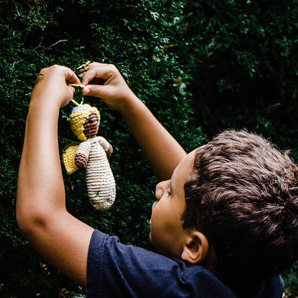Looking for heirloom ornaments that are also safe for babies first Christmas? Look no further. Pebble Christmas ornaments are handmade with soft cotton yarn and stitched carefully with love. This brown-skinned Angel is designed with baby's safety in mind. These Christmas decorations are non-toxic and soft, with no removable parts. As always, Pebble Toys are Fair Trade, Eco-friendly and sustainable.