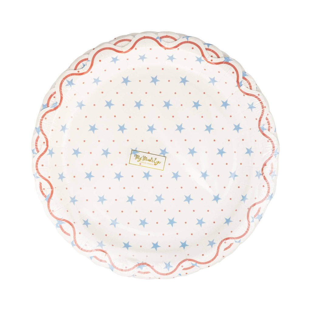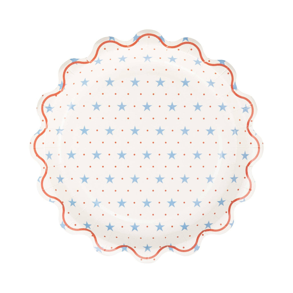 Perfect for 4th of July parties, these charming plates feature a mini star pattern and elegant scalloped edges. Bring some playful flair to your table setting with these uniquely fun plates! * 8 scalloped circle paper plates * 9" x 9"