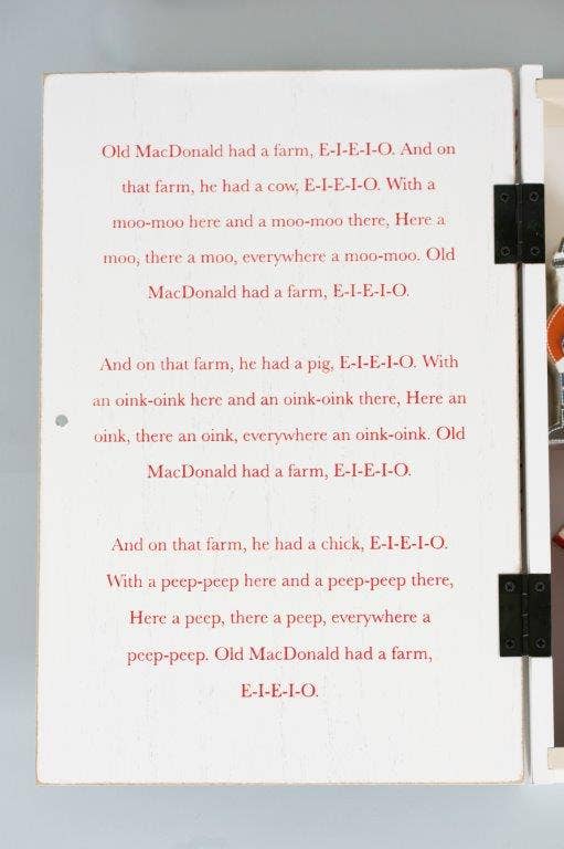 Each piece of this delightful set fits neatly inside the wooden "book" for easy storage, while the enchanting cover adds a touch of rustic charm to any bookshelf or coffee table. Our story is printed on the inside. Included is a red barn with door that opens, our farmer himself, a pig, a chick, and a cow.